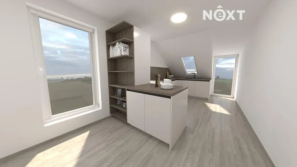 Byt je téměř dokončený. Finální venkovní úpravy jsou naplánovány na březen 2026. Ve vizualizacích je možné vidět návrh kuchyňské linky.