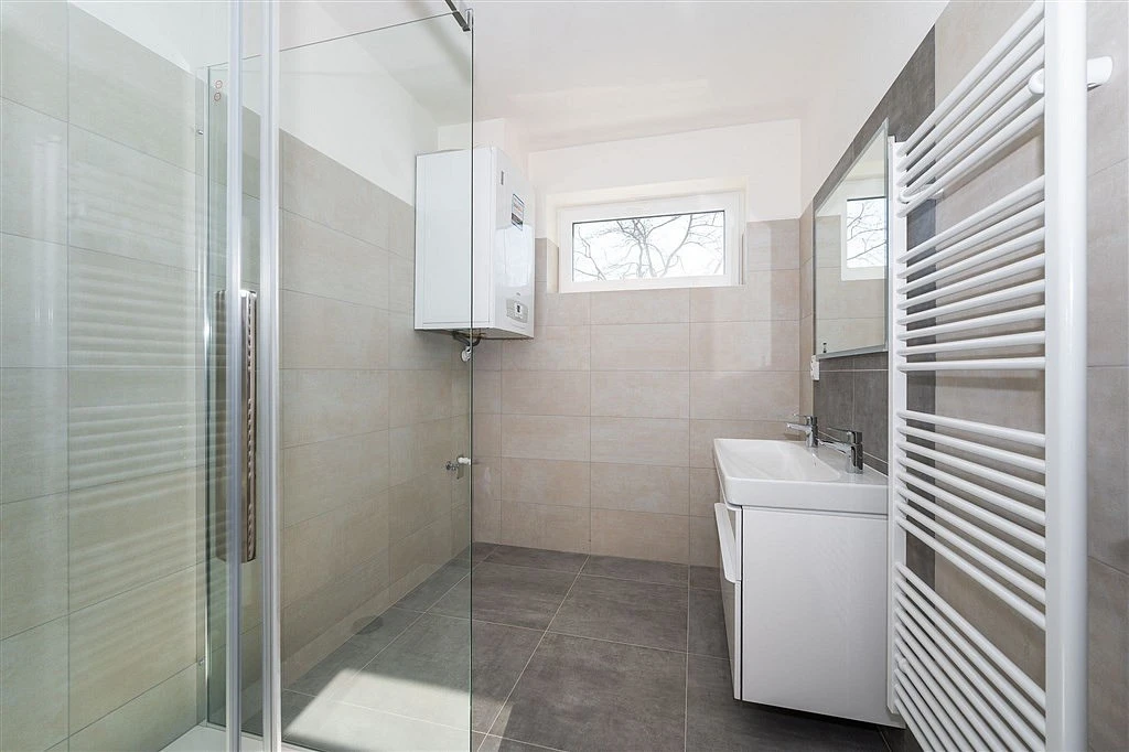 ___ Skutečně pěkný a velkými okny prosvětlený byt, je vybaven v pěkném standardu. Plynové kondenzační kotle umístěné v kotelně v suterénu domu nabízejí podlahové vytápění a v obou pokojích je rovněž klimatizační jednotka, která v létě chladí a v zimně může topit. Vstupní dveře s bezpečnostním kováním, vnitřní dveře s obložkovou zárubní. Plastová okna s izolačním trojsklem, plovoucí podlahy s vysokou odolností. Značkové vybavovací předměty v koupelně, velkoformátová keramická dlažba i obklady. Příprava na instalaci kuchyňské linky s digestoří (kuchyně není v ceně). Dekory a barevnost si můžete ve třech studiích doladit podle vašich představ. K bytu je možné zakoupit garážové stání v suterénu, nebo venkovní parkovací stání. Nízké provozní náklady na bydlení, a to jak díky jeho uspořádání, tak i díky použitým materiálům. Dům je zařazen v energetické třídě B, tedy velmi úsporný.