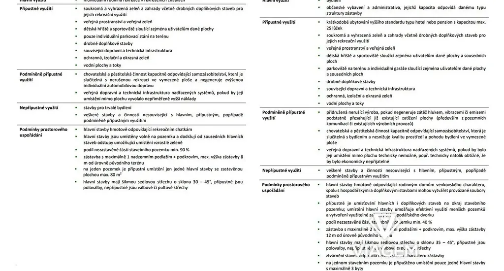 Možnosti využití pozemků jsou dány územní plánem, který předurčuje pozemky pro rekreační zástavbu se specifikací “RI - individuální rekreace” a “SV2 - smíšené obytné venkovské 2”.