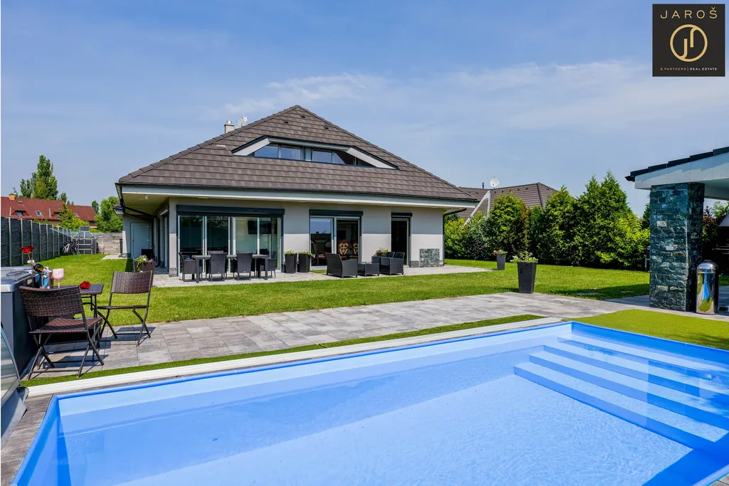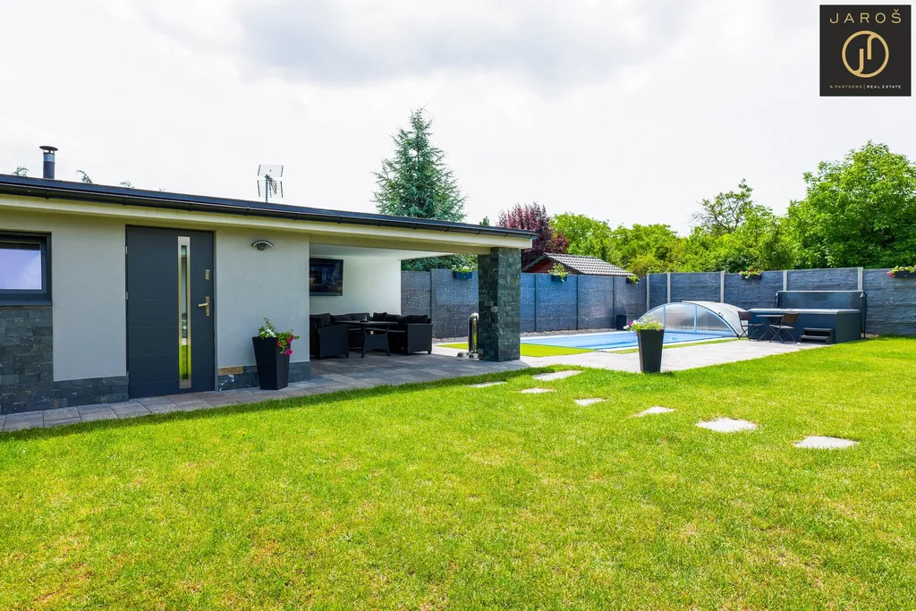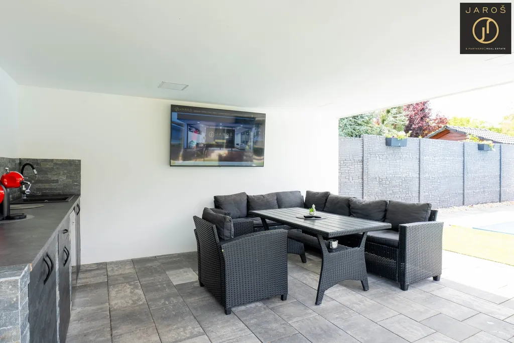 Zahrada nabízí absolutní soukromí díky kompletnímu oplocení. V zadní části se nachází stylový zahradní domek s venkovní kuchyní a krytým posezením, ideální pro letní večery s rodinou nebo přáteli. Nechybí ani vyhřívaný bazén se slanou vodou a zastřešením, vířivka a dostatek prostoru pro relaxaci i zábavu.