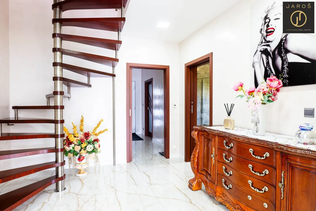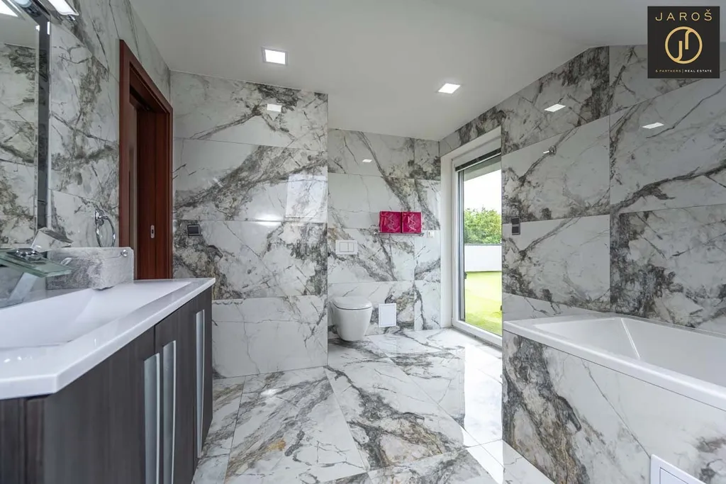 V patře se nachází hlavní ložnice s vlastní šatnou, dva další samostatné pokoje, koupelna s vanou a přístup na nádhernou soukromou terasu, která poskytuje klidné útočiště a výhled do zeleně. Každý detail domu byl pečlivě promyšlen tak, aby odpovídal potřebám i těch nejnáročnějších klientů – od podlahového vytápění, centrálního vysavače až po kvalitní materiály a designové prvky.