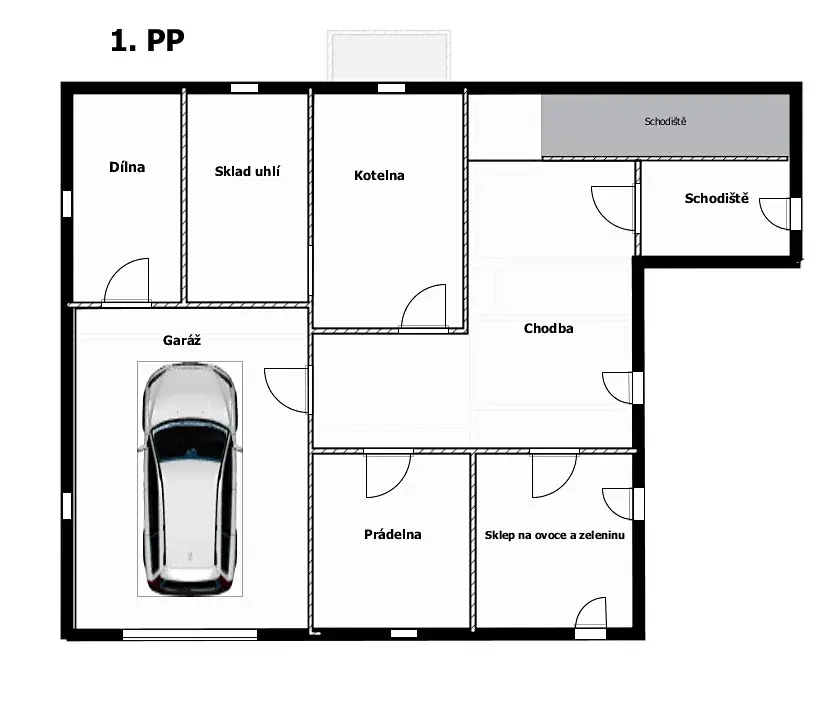 Dům je plně podsklepený – spodní podlaží poskytuje technické zázemí, sklepní prostory, dílnu, kotelnu, prádelnu a garáž.