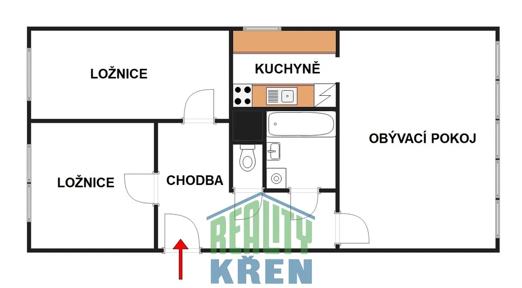 Vstupní chodba 8,7 m2, kuchyně 6,1 m2, obývací pokoj 25,8 m2, 2x ložnice (12,9 m2 a 9,8 m2), koupelna s vanou 2,6 m2, samostatné WC. K bytu náleží komora na patře 0,7 m2.