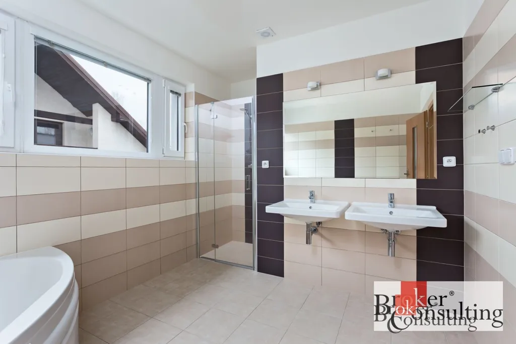 V prvním patře je koupelna s vanou, sprchovým koutem a odděleným WC.