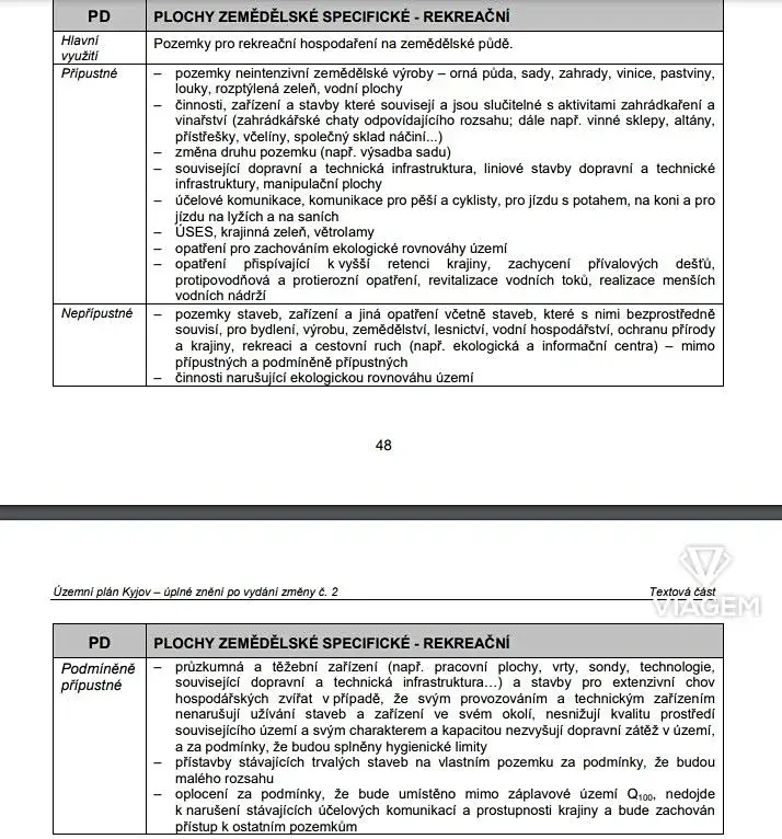 Možnosti využití pozemků jsou dány územní plánem, který předurčuje pozemky pro rekreační využití se specifikací “PD - rekreační plochy”.