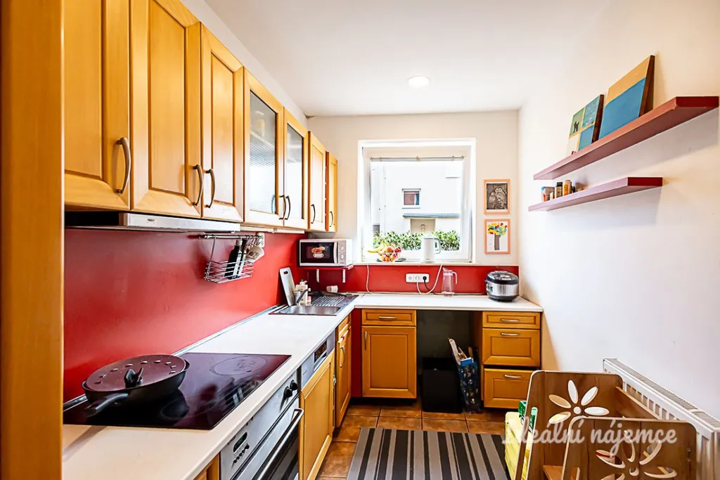Interiér je nabízen jako plně vybavený, takže se můžete rovnou nastěhovat bez starostí s nákupem nábytku či spotřebičů. Srdcem domova je moderní kuchyně, ve které nechybí lednice s mrazákem, myčka, elektrická i mikrovlnná trouba a varná deska s digestoří. Na kuchyni navazuje prostorná hlavní obytná místnost s pohodlnou sedací soupravou a příjemným jídelním koutem. Další dvě samostatné místnosti jsou aktuálně prakticky rozvrženy jako ložnice a dětský pokoj, skvěle však poslouží i jako pracovna. Koupelna s vanou a pračkou je oddělena od toalety, což zajišťuje maximální soukromí všech členů domácnosti.