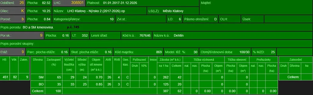 - p.č. 745 vedená jako lesní pozemek o celkové výměře 1 634 m2 (stáří lesa 91 let - zastoupení dřevin borovice, smrk),
