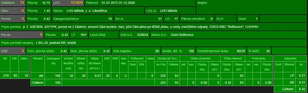 - p.č. 426/3 vedená jako lesní pozemek o celkové výměře 4 199 m2, z toho vlastníme podíl 1/4 tedy 1 050 m2 (stáří lesa 94 let - zastoupení dřevin akát).