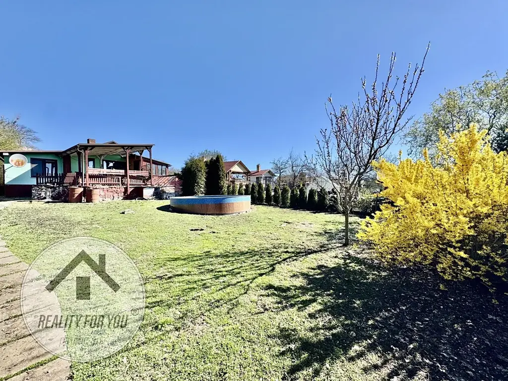Dominantou lehce svažitého pozemku je bazén o objemu cca 25 m³ s pískovou filtrací – ideální pro letní relaxaci.