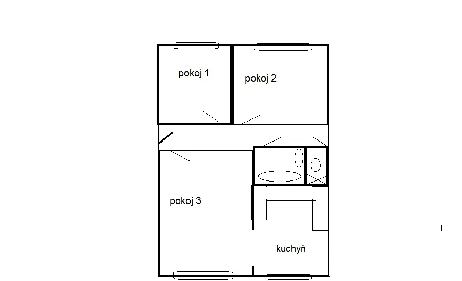 Byt je třípokojový, kuchyně s prostornou rohovou linkou je propojená větším vstupem s obývacím pokojem.