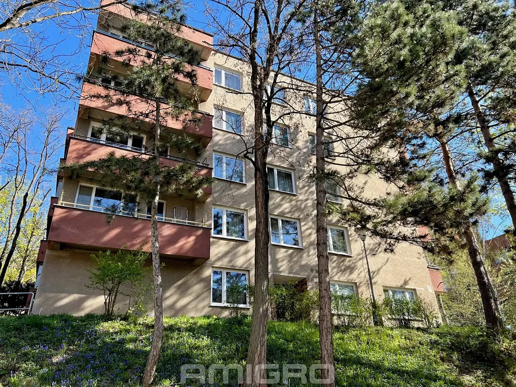 Byt s výhledem do okolní zeleně se nachází v předposledním podlaží čtyřpodlažního cihlového domu.