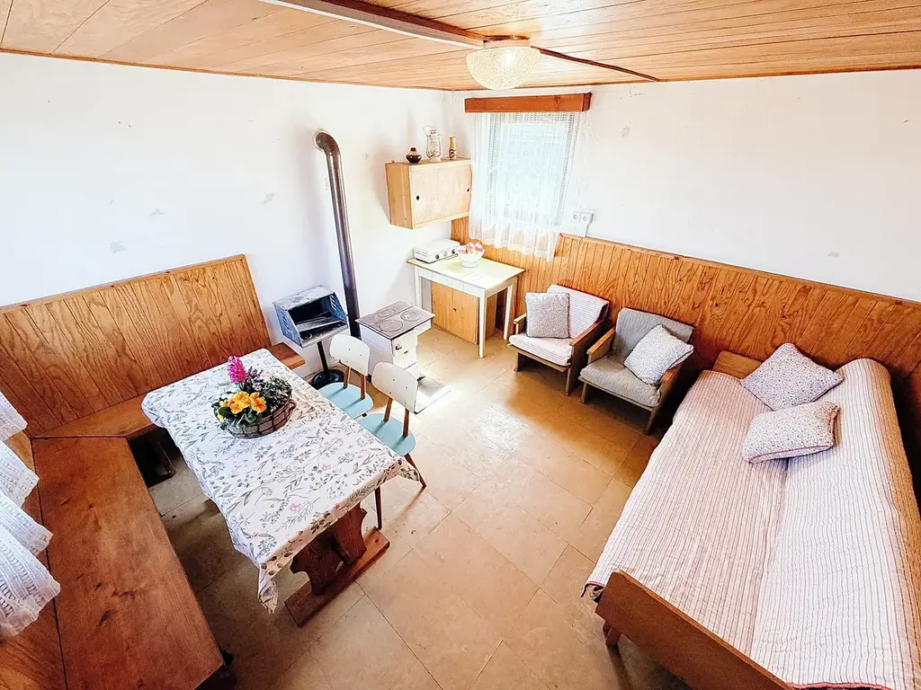 Obytnou část tvoří jedna místnost s kamny, která vás v chladných dnech příjemně zahřejí, nebo na nich můžete i něco uvařit. Po žebříku se z místnosti dostanete na nízkou půdu s okénkem. Zde je možné udělat spaní.