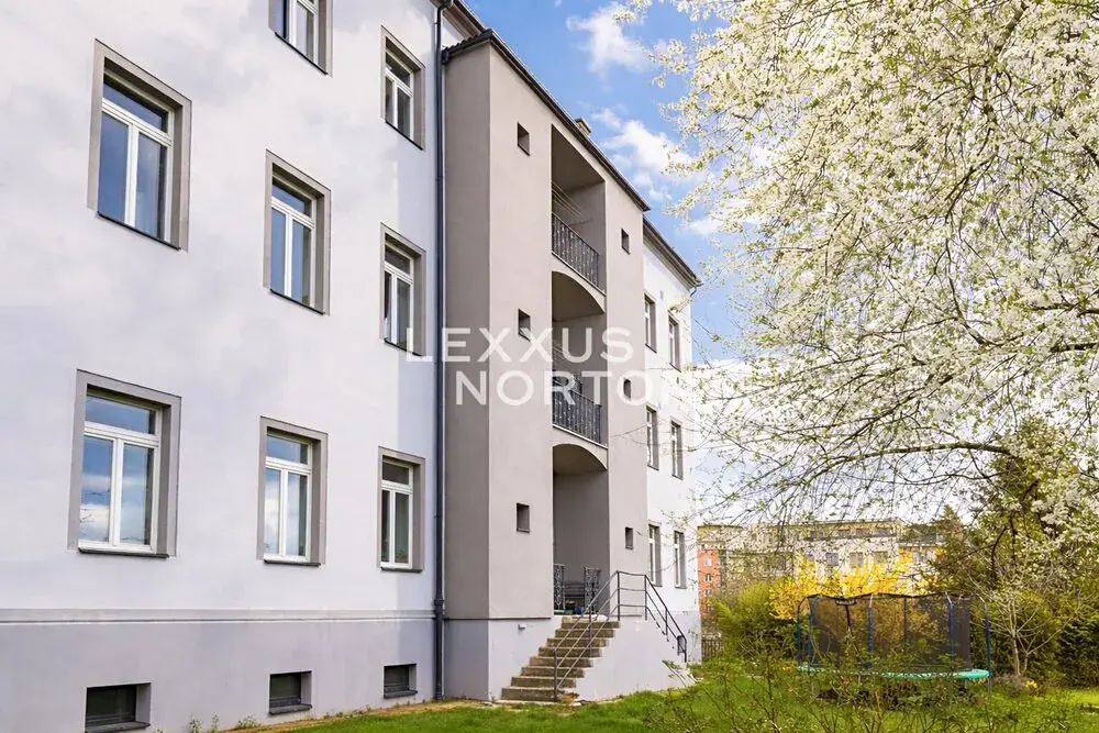 Vstup do bytu je řešený centrální pavlačí s přirozeným denním světlem, která funkčně propojuje obě původní jednotky. Dispozice aktuálně nabízí dva obývací pokoje a dvě ložnice. Samostatná kuchyně je příjemně prosvětlená velkým oknem do pavlače. Další část bytu doplňuje koupelna s vanou a oddělená toaleta. Velkým benefitem je možnost využívání společné zahrady, a navíc i s částí výhradně pro majitele bytu.