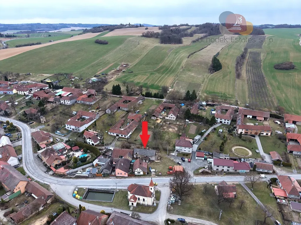 Pozemek má 241 m² a leží přímo na návsi, v samotném srdci obce. Jen pár kroků od malého kostelíka, který dotváří atmosféru místa.