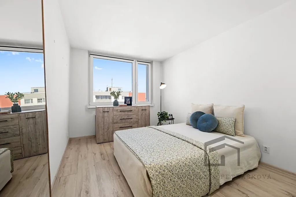 Byt s podlahovou plochou 78 m2 a lodžií 7 m2 se nachází v posledním 8.patře (9.NP) s okny na jih a sever. Bytová jednotka prošla v posledních letech kompletní rekonstrukcí a disponuje chodbou, kde je možnost si dle svého uvážení zařídit šatnu, vstupem do jednotlivých pokojů a do obývacího pokoje s kuchyní. Ložnice i dětský pokoj mají stejnou výměru, necelých 13 m2, okna na sever a vestavěnou šatní skříň. Dále je zde vstup do koupelny se sprchovým koutem, na oddělenou toaletu s bidetovou sprškou a do technické místnosti, kam se vejde pračka, sušička i věci, které nepotřebujete. Centrem domova je slunný a zároveň prostorný obývací pokoj (orientace na jih) s kuchyňským koutem a ostrůvkem (30 m2), zde je i přístup na velkorysou lodžii s příjemným výhledem do okolí. Kuchyně je vybavená indukční sklokeramickou deskou, digestoří s odtahem do komína, horkovzdušnou troubou, dostatkem úložného prostoru, lednicí a ostrůvkem. V kupní ceně jsou zahrnuty i některé kusy nábytku, pračka a sušička.