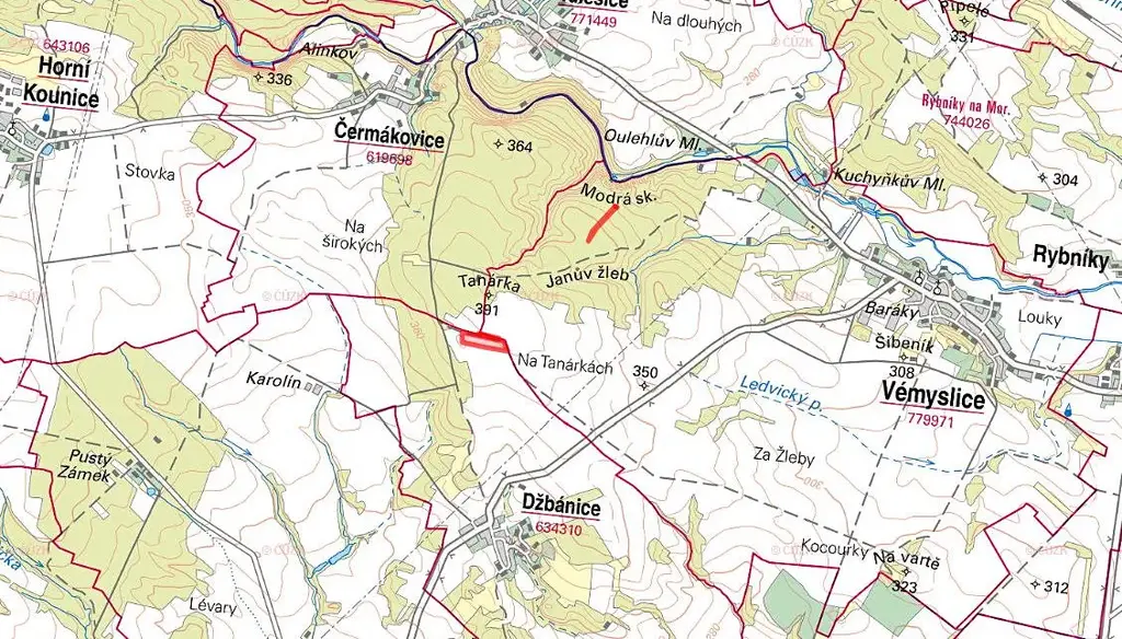 Nabízím k prodeji vlastnictví 1/3 na zemědělských pozemcích v obcích Džbánice a Vémyslice, okres Znojmo. Pozemky jsou zapsány na LV 88 (k.ú. Džbánice) a LV 312 (k.ú. Vémyslice). Celková výměra všech dotčených parcel činí 33 215 m², z toho k prodeji je 11 072 m².