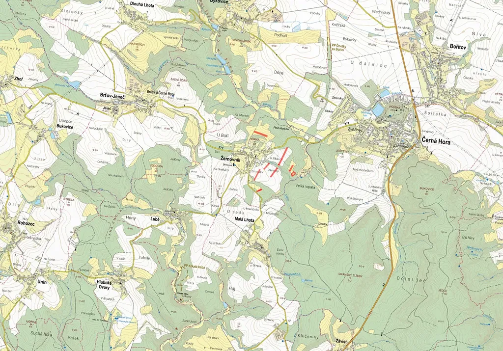 Žernovník u Černé Hory, celková výměra 21 198 m2, výměra určené k prodeji je 5 300 m2.