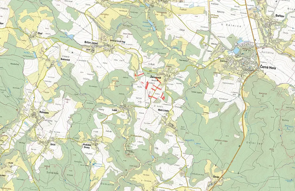 Žernovník u Černé Hory, celková výměra 37 071 m2, k prodeji je pak určena výměra 9 268 m2.