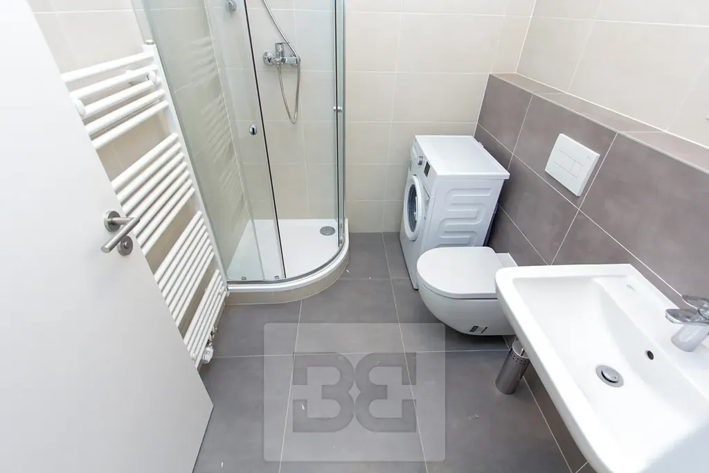 Koupelna je vybavena sprchovým koutem, umyvadlem, zrcadlem, topným žebříkem a WC, k dispozici je také pračka. Byt má plastová okna a jeho velkou výhodou je klimatizační jednotka.