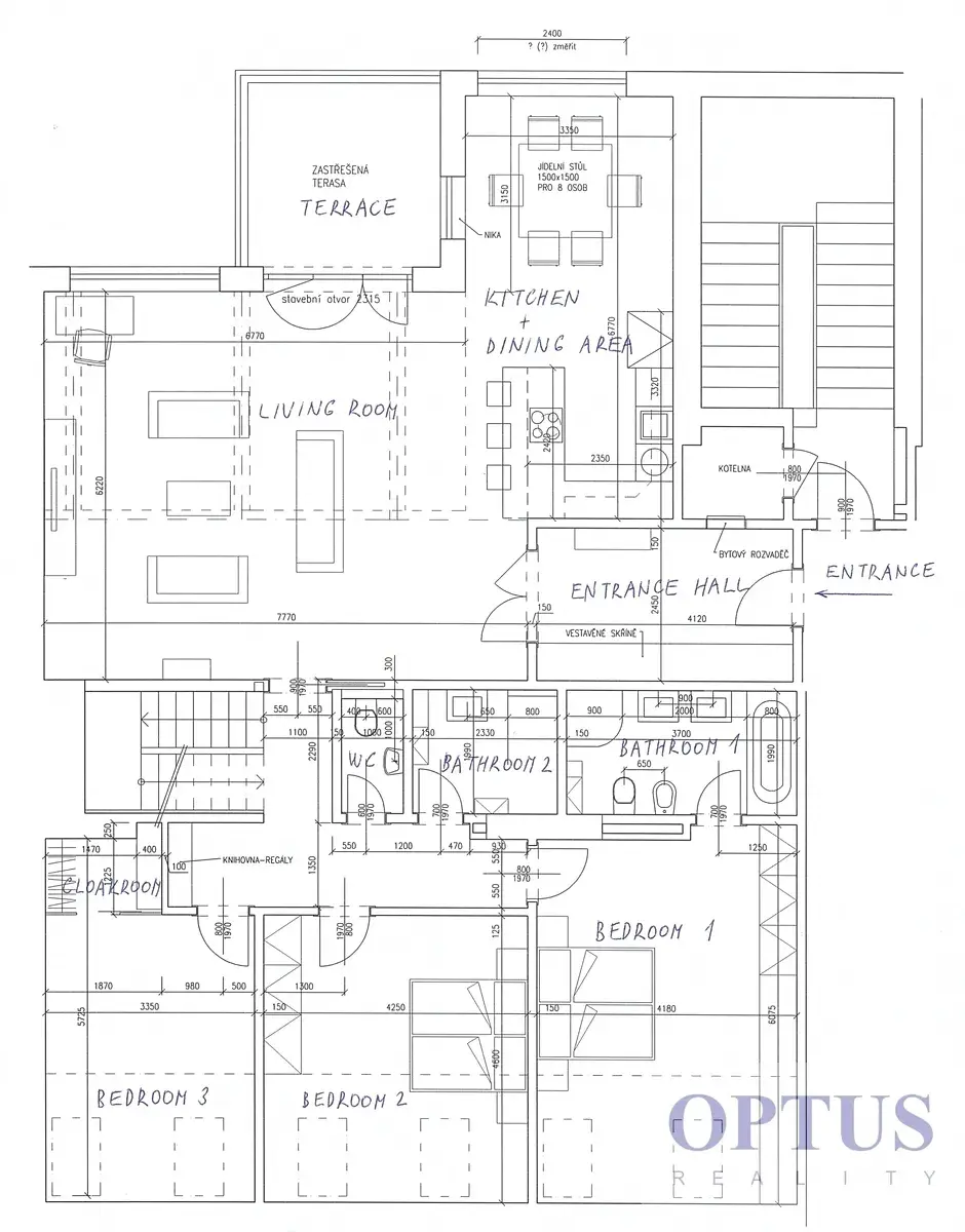 Byt tvoří prostorný obývací pokoj o velikosti cca 67 m2 propojený s kuchyňským a jídelním koutem, s lihovým krbem a se vstupem na terasu situovanou do rozlehlého dvorního traktu, dále jsou v bytě 4 ložnice (o velikosti cca 2x 24 m2, 20 m2 a 15 m2) - hlavní ložnice má vlastní koupelnu, pracovna 11 m2 (s pračkou a sušičkou), 2 koupelny, samostatná toaleta, prádelna, komora a vstupní chodba se skříní.