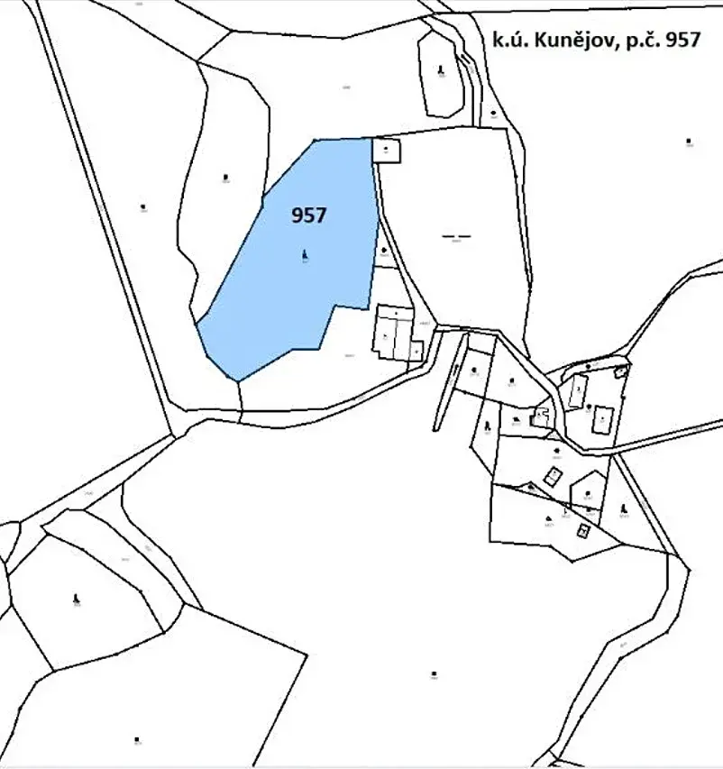 Jedná se o lesní pozemek - p.č. 957 v k.ú. Kunějov o výměře 8445 m2. Na pozemku se nachází smíšený mýtní porost (zakm. 7). Vede přes něj vedení NN a vodovodní řad.