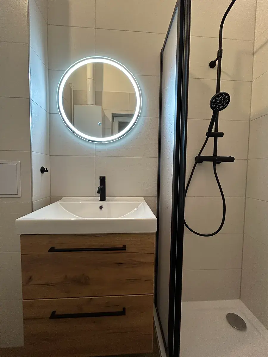 Nově zrekonstruovaná moderní koupelna se sprchovým koutem, skříňkou a zrcadlem. V koupelně instalován plynový kondenzační kotel Buderus, přívod na pračku a sušičku.