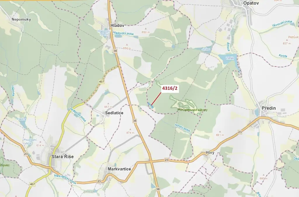 "Lesní pozemek o výměře 7085 m2, parcelní číslo 4316/2, podíl 1/1, katastrální území Opatov na Moravě, obec Opatov, obec s rozšířenou působností Třebíč, okres Třebíč, Kraj Vysočina. "