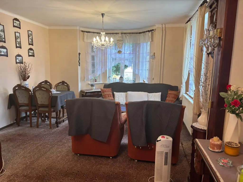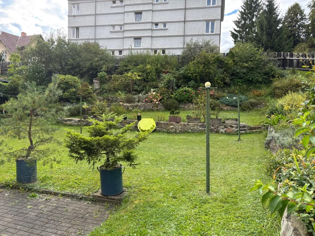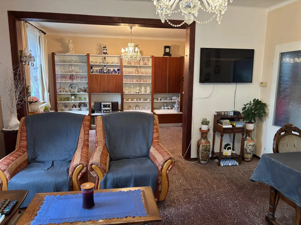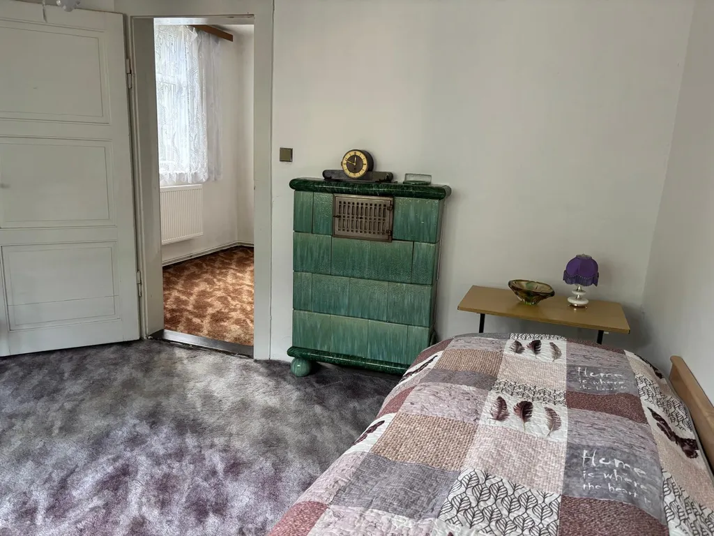 Co se týče samotného domu: V 1 NP domu se nachází veranda, chodba a vstup do velkého obývacího pokoje s arkýřem. Dříve byl pokoj rozdělen do dvou pokojů. Krásný výhled do zahrady. Vedle je malá kuchyně, koupelna a samostatné WC a dolů směr sklep, nahoru do patra, kde se nacházejí tři pokoje. Jeden pokoj plně samostatný, dva pokoje průchozí s krásným vestavěným krbem a v jednom zadním pokojíku je balkonek. Dále je zde WC a příprava na sprchový kout. Nahoru vstup na suchou čistou půdu. U domu je i rampa pro lidi s omezenou hybností. Je potřeba opravit.