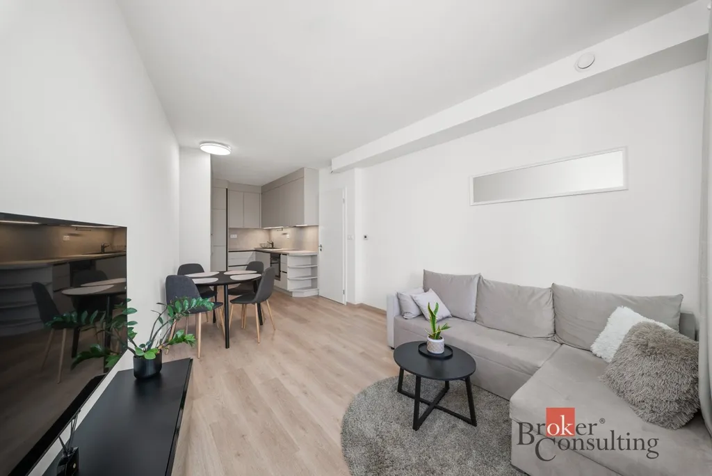 Interiér bytu je vybaven nábytkem na míru, včetně plně zařízené kuchyňské linky. Součástí bytu je koupelna se sprchovým koutem a k dispozici je také pračka se sušičkou, kterou lze ovládat přes mobilní aplikaci. Byt nabízí dostatek úložných prostor a díky instalované rekuperaci je zajištěn neustálý přísun čerstvého vzduchu bez nutnosti větrání. Kvalitní trojskla zároveň zajišťují maximální klid, takže do bytu neproniká hluk z ulice.