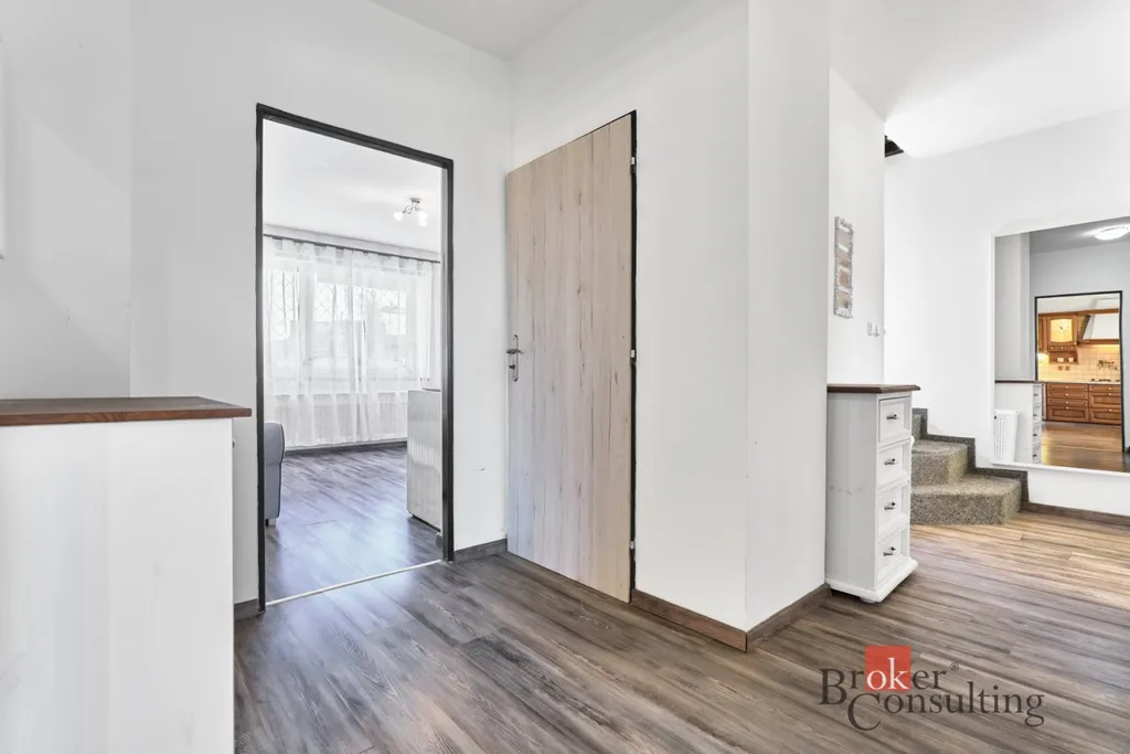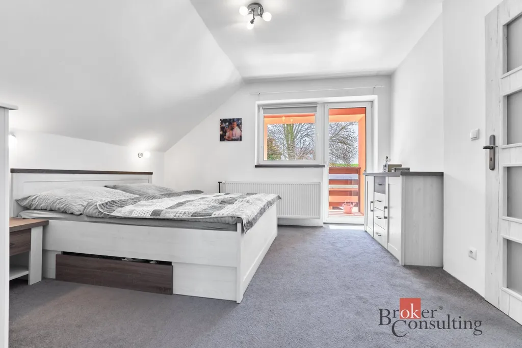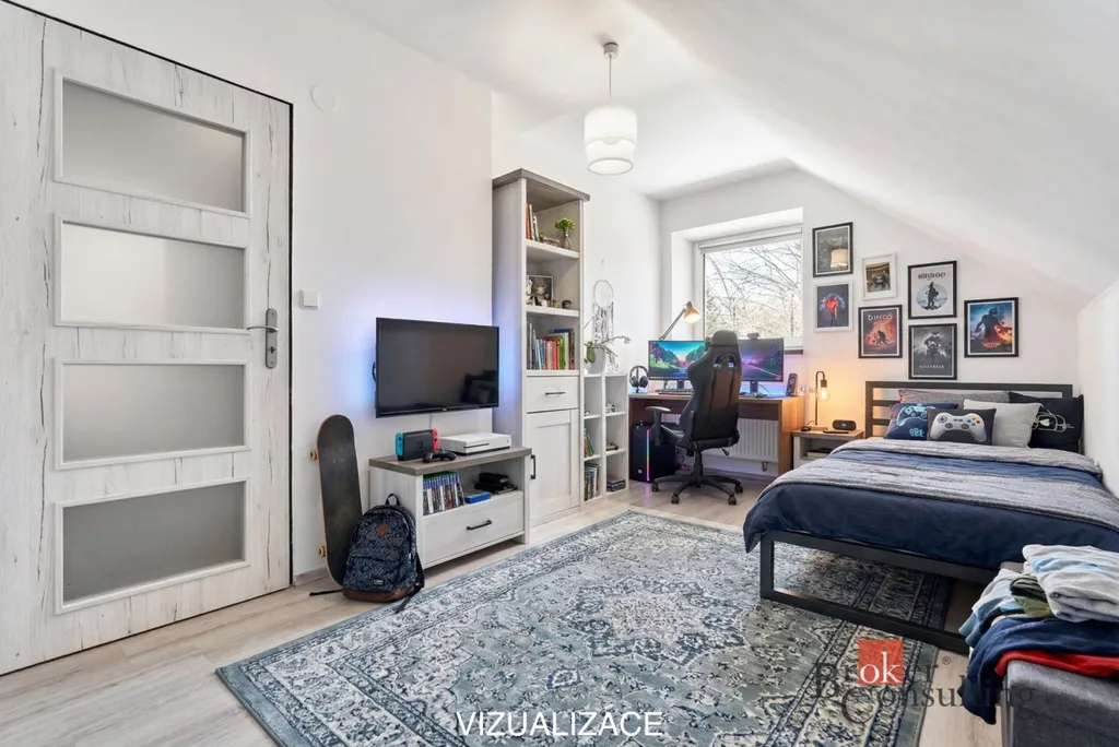 Dispozice domu je prakticky řešena. V přízemí se nachází kuchyň s jídelním prostorem navazující na obývací pokoj, dále koupelna, samostatná toaleta a místnost, kterou lze využít jako pracovnu nebo ložnici. V patře je hlavní ložnice s balkonem navazující na šatnu či pracovnu a dva samostatné dětské pokoje. Součástí domu je také sklep o velikosti 25 m² a půdní prostor se zatepleným stropem.
