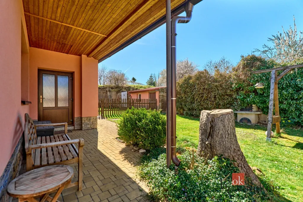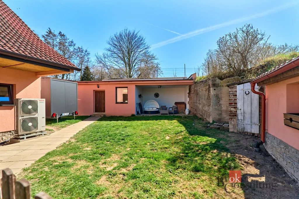 K domu náleží prostorná zahrada, na které se nachází zahradní domek poskytující další úložný prostor, skleník a vzrostlé ovocné stromy (meruňky, třešně, jabloně). Pro rodiny s dětmi je zde připravena i dětská prolézačka. Na pozemku je rovněž vrtaná studna s možností obnovení využití.