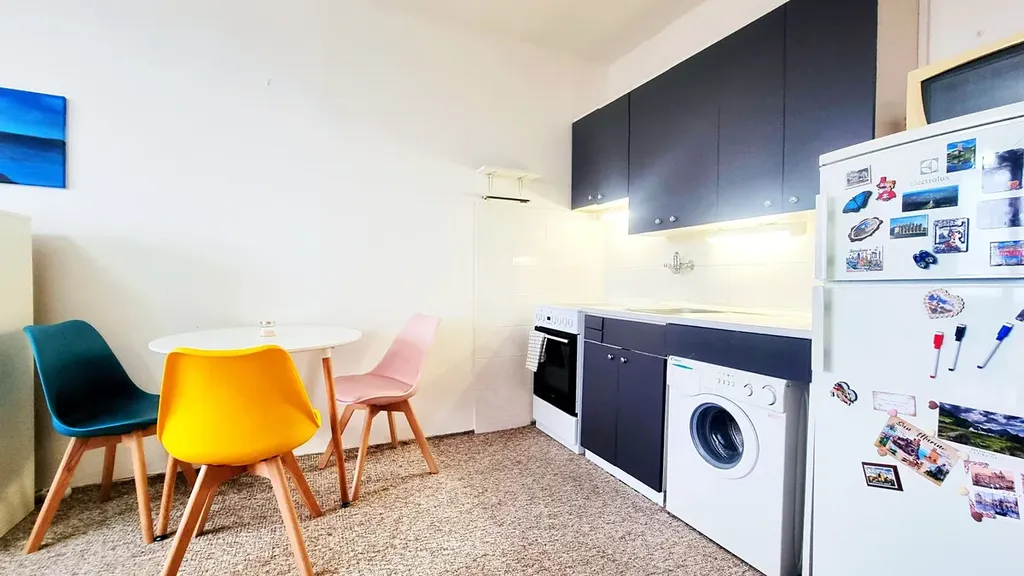 Kuchyňská část je vybavena kuchyňskou linkou s mikrovlnkou, horkovzdušnou troubou s varnou deskou, kombinovanou lednicí, varnou konvicí, kuchyňským náčiním a pračkou.