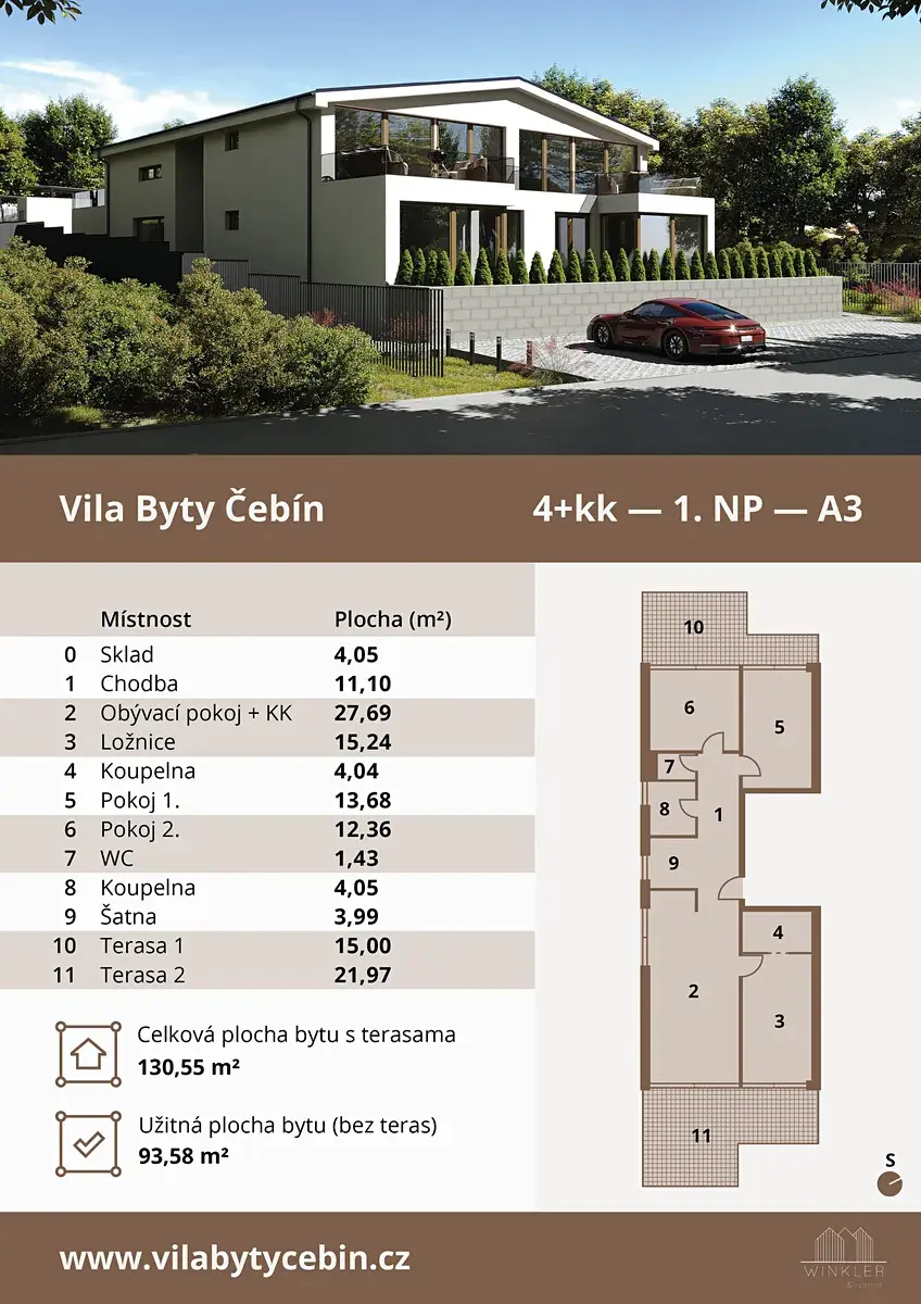 V nově vznikajícím projektu nabízíme k prodeji prostorný byt 4+KK o ploše 93,58 m² s dvěma terasami o velikostech 15 m² a 21,97 m², v klidné lokalitě obce Čebín, která je vzdálena pouze 12–15 minut od Brna. Čebín nabízí veškerou občanskou vybavenost včetně obchodu, školy a školky, a je dobře propojena s Brnem vlakovým i autobusovým spojením, čímž odpadá nutnost automobilu.