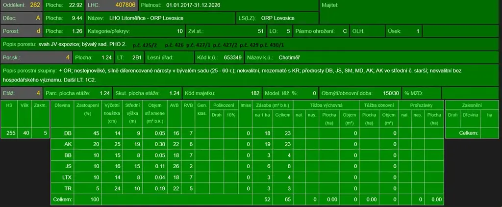 - p.č. 426 vedená jako lesní pozemek o celkové výměře 5 665 m2 (stáří lesa 49 let - zastoupení dřevin dub, akát, javor, jasan, třešeň ptačí),