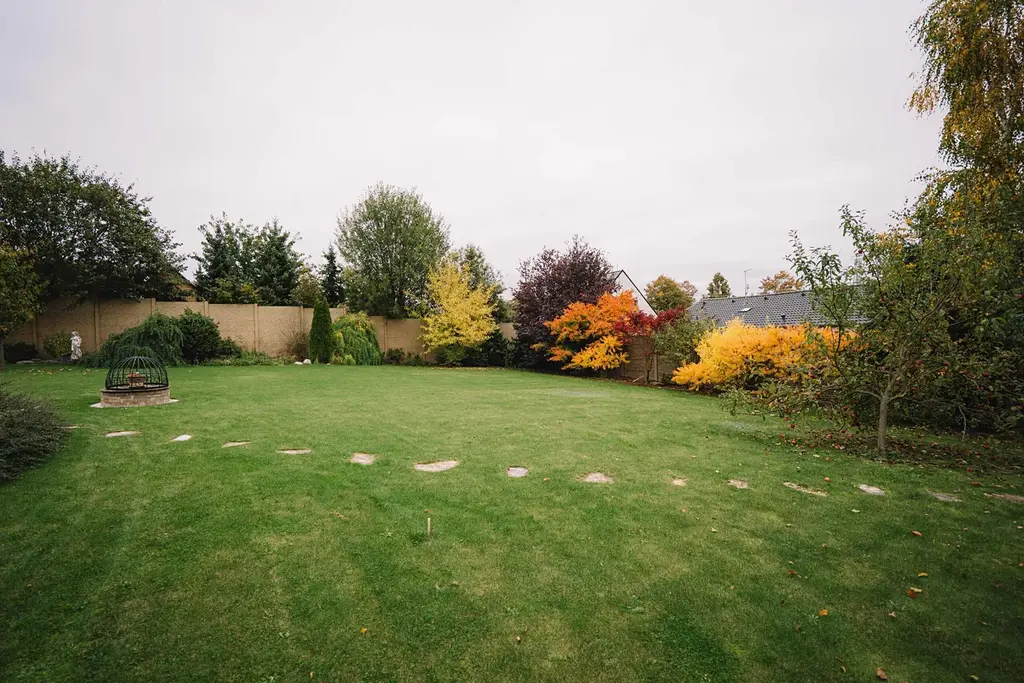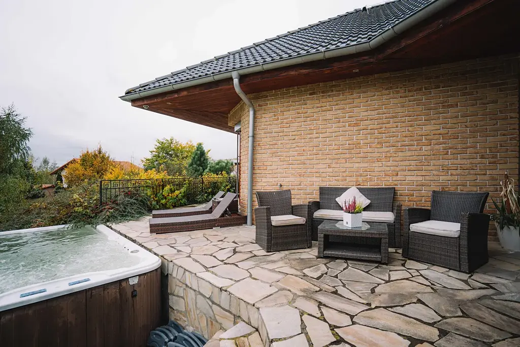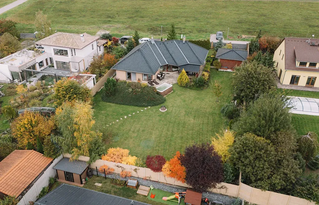 Zahrada je opravdovou oázou klidu – díky vzrostlým stromům a betonovému plotu nabízí naprosté soukromí. Vychutnáte si tu grilování, koupání ve vířivce nebo večerní posezení u ohně.
