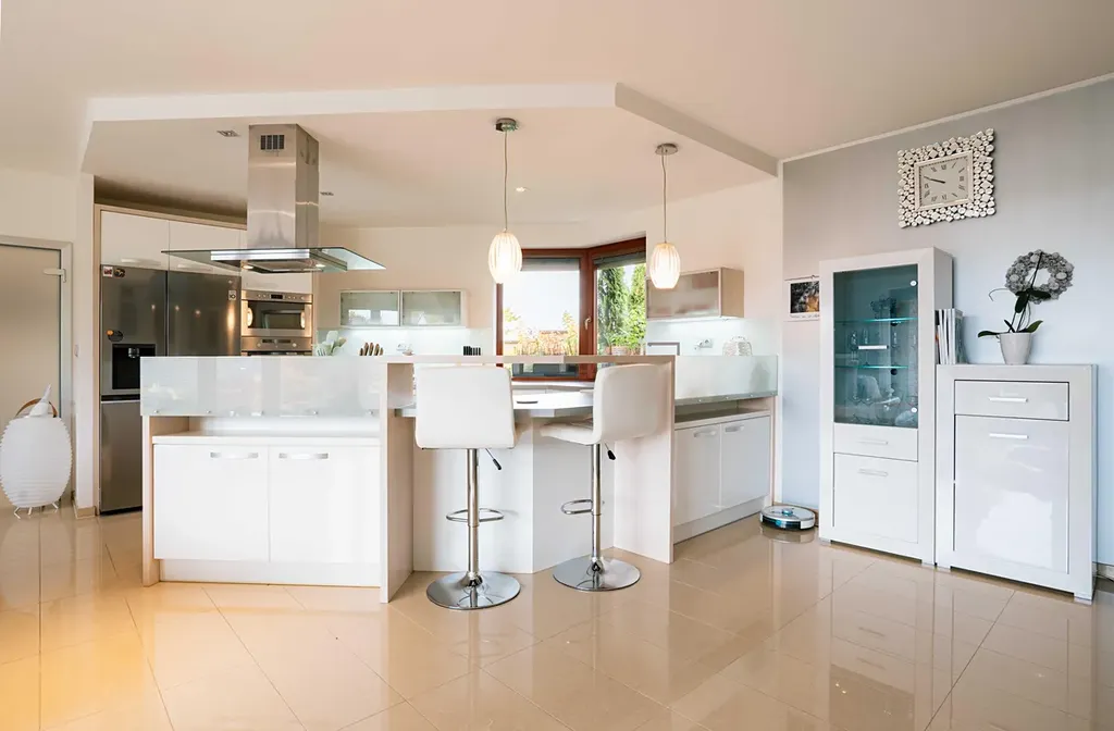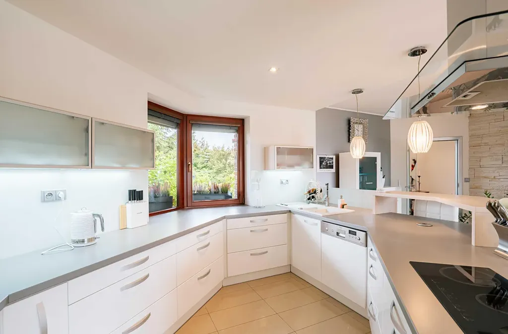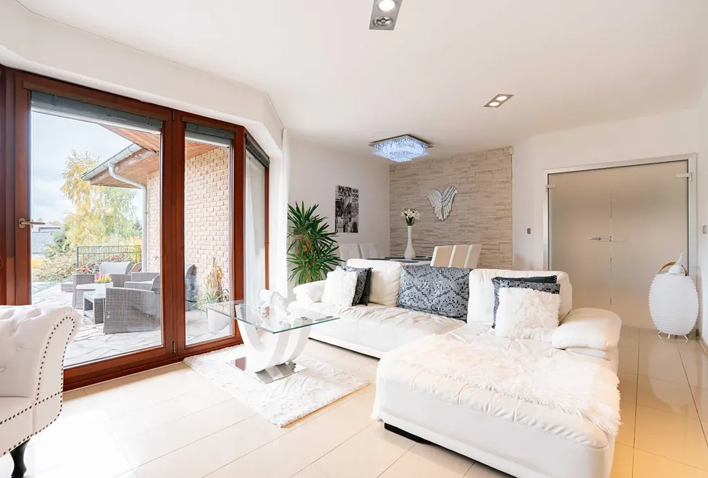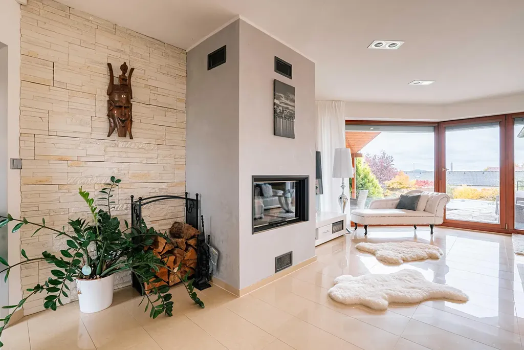 Dominantou domu je prostorný obývací pokoj s kuchyní a krbem o výměře 50 m². Díky velkým francouzským oknům je celý dům dokonale prosvětlený a propojený se zahradou.