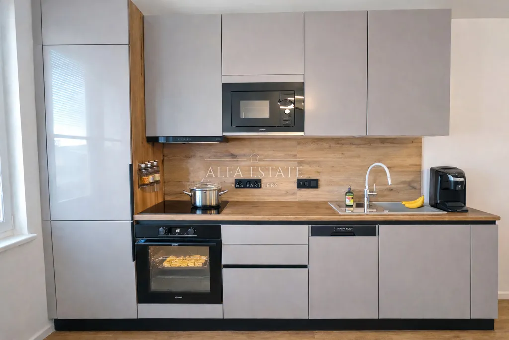 Srdcem bytu je moderní kuchyňská linka vyrobená na míru se spotřebiči značky Gorenje, která elegantně navazuje na obývací část a vytváří otevřený, vzdušný a příjemný obytný prostor. Ve stejném kvalitativním standardu byla zhotovena také prostorná vestavěná skříň v předsíni, rovněž značky Gorenje. Koupelna byla navržena s důrazem na estetiku i praktičnost a nabízí prostorný sprchový kout o velikosti 120 cm i citlivě řešený prostor pro pračku a sušičku.