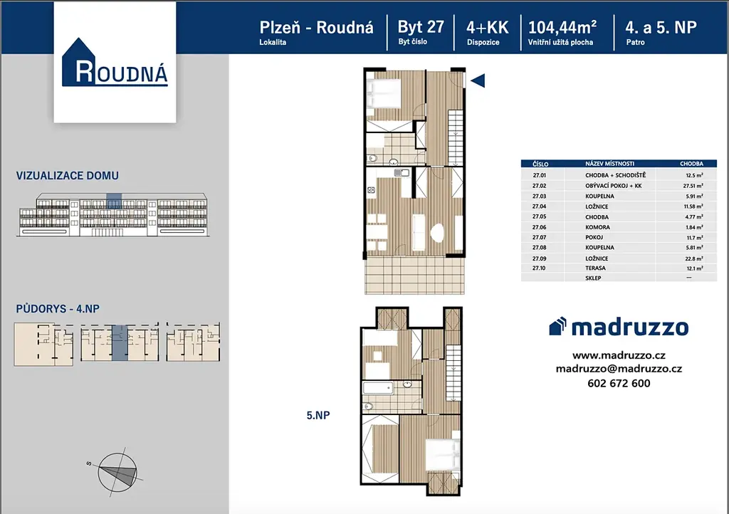 Nyní je v prodeji mezonetový byt o dispozici 4+kk a velikosti 104 m² s prostornou terasou 12 m², umístěný ve 4. a 5. nadzemním podlaží. Byt je ideální pro rodiny i páry, které hledají dostatek prostoru a pohodlí.