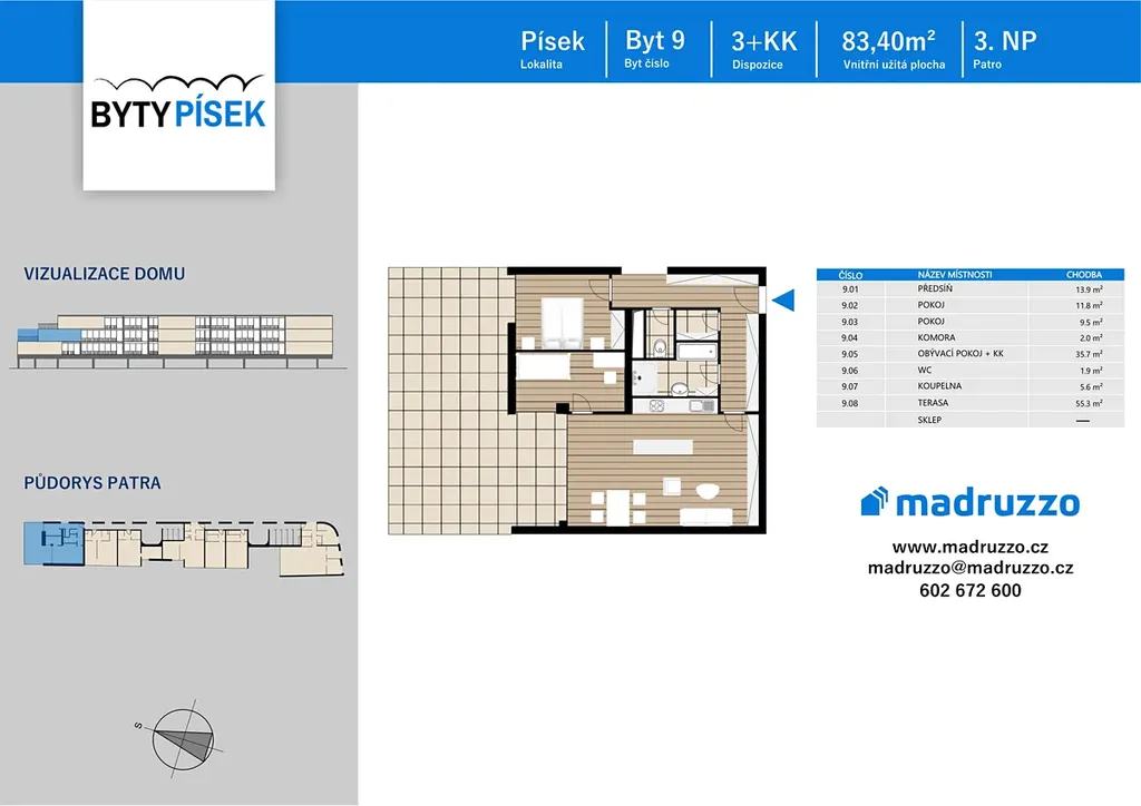 Nabízíme Vám prakticky řešený byt č. 9 o dispozici 3+kk a velikosti 83,4 m2 s prostornou terasou o velikosti 55,3 m2 umístěný ve 3. NP. Byt je vhodný nejen pro rodiny, ale určitě zaujme také páry, které mají rády prostorné bydlení.