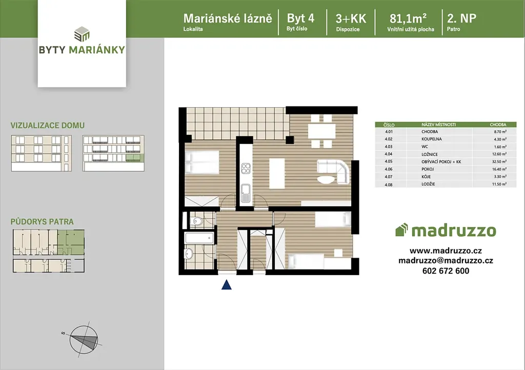 Nabízíme Vám prakticky řešený byt č. 4 o dispozici 3+kk a velikosti 81,1 m2 s prostornou lodžií o velikosti 11, 5 m2 umístěný ve 2. NP. Byt je vhodný nejen pro rodiny, ale určitě zaujme také páry, které mají rády prostorné bydlení.
