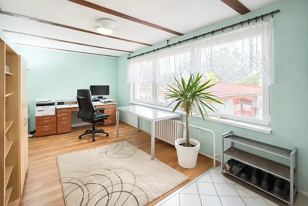 Dům o užitné ploše 104 m2 sestává ze vstupní kryté verandy (možno i jako kancelář), vstupní chodby, obývacího pokoje propojeného pouze vzdušnou variantou dělícího pultu do kuchyňské části s jídelním koutem, ložnice, dalšího pokoje, koupelny s vanou i sprchových koutem a samostatné toalety. V suterénu domu je další obytná místnost (18 m2) se saunou s možností využití např. jako domácího fitness nebo kancelář. V horní části domu je půdní prostor (55 m2), kde jednu z místností lze okamžitě využít a další část zrekonstruovat pro další využití.