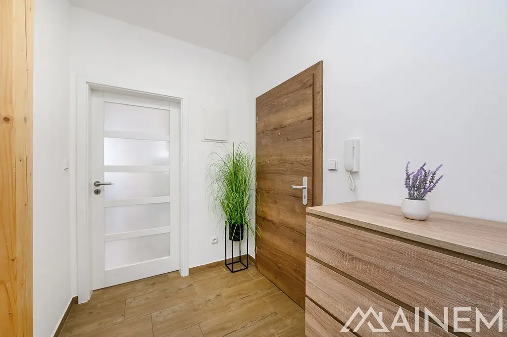 Byt se skládá z prostorného obývacího pokoje s kuchyňským koutem se vstupem na balkon, ložnice, předsíně a koupelny. Kuchyňská linka je vybavena lednicí, varnou deskou a horkovzdušnou troubou. Koupelna disponuje moderními sanitami, sprchovým koutem a WC. Vytápění je řešeno komfortním podlahovým topením, ohřev vody a vytápění zajišťuje plynový kotel.