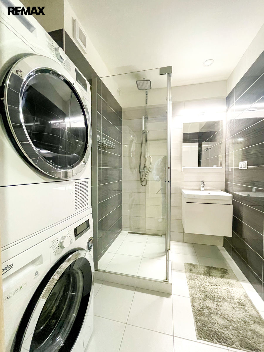 Po vstupu do bytu se dostanete do prostorné předsíně, kde je dostatek úložného prostoru pro všechny vaše věci. Dále se zde nachází prostorný obývací pokoj s moderní televizní stěnou. Kuchyň je zde velice velkoryse řešená a disponuje všemi potřebnými spotřebiči. Nachází se zde myčka, lednice s mrazákem, elektrická trouba a mikrovlná trouba, a také plynový sporák. V centru kuchyně je praktický ostrůvek, na který navazuje jídelní stůl. Je zde také vchod na jeden ze dvou balkonů v bytě.