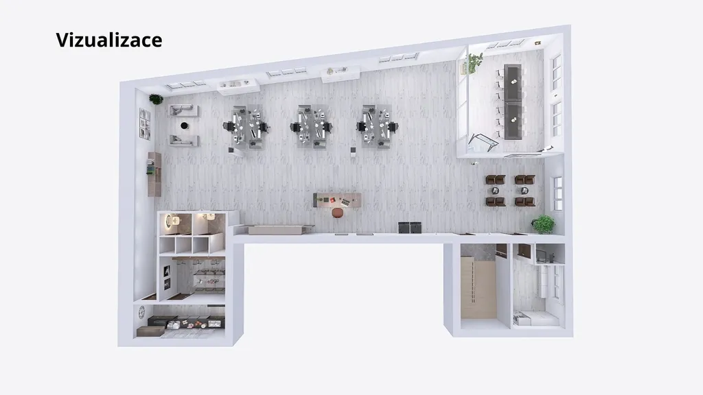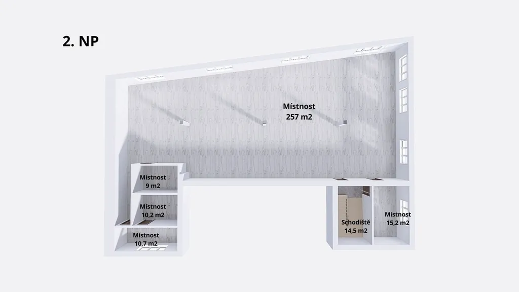 1. patro (317 m²): Velkorysý otevřený "open-space" vhodný pro moderní fitness, call centrum, lékařské ordinace či školící středisko