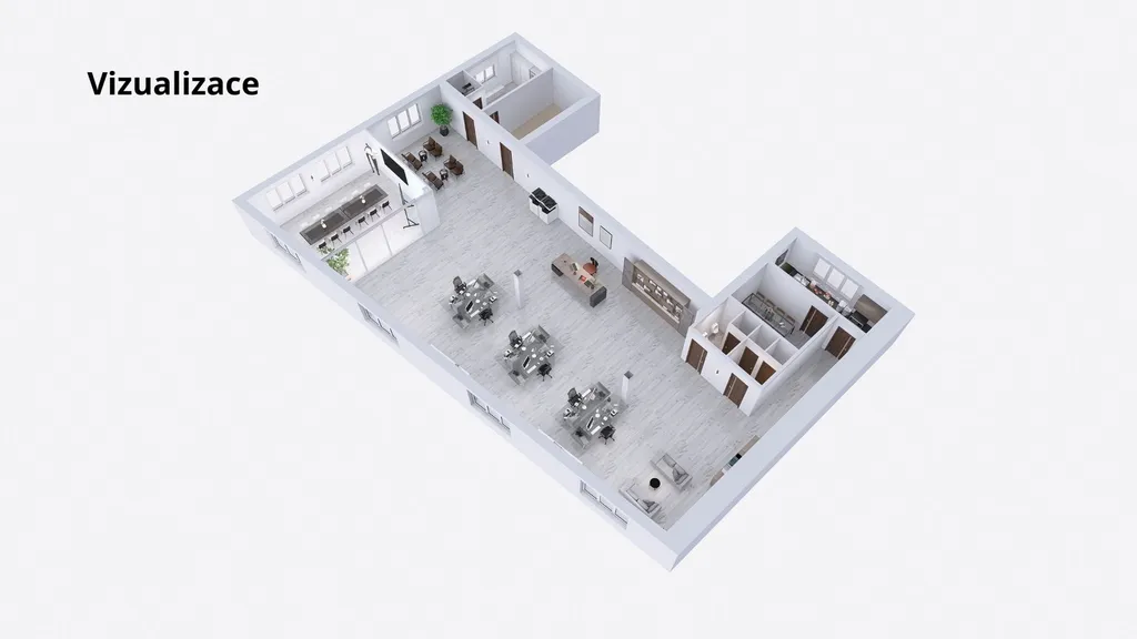 Přízemí (342 m²): Reprezentativní prostory s úctyhodnou výškou stropu 4,5 m. Ideální pro prodejnu, showroom, lékárnu nebo klientské centrum