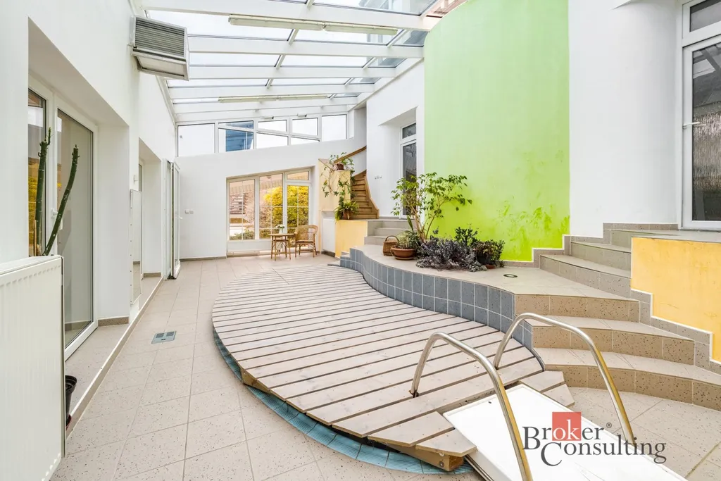Dominantou propojení obou částí domu je světlé, kryté atrium s vnitřním bazénem vybaveným protiproudem, které vytváří jedinečnou atmosféru celého prostoru. Z této části je rovněž přístup do suterénu, kde naleznete saunu, prostor vhodný pro menší fitness a další místnosti určené ke skladování.