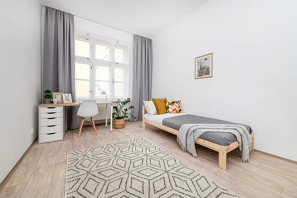 - zařízený (šatní skříň, závěsy a záclony, postel včetně lůžkovin, stůl + židle)