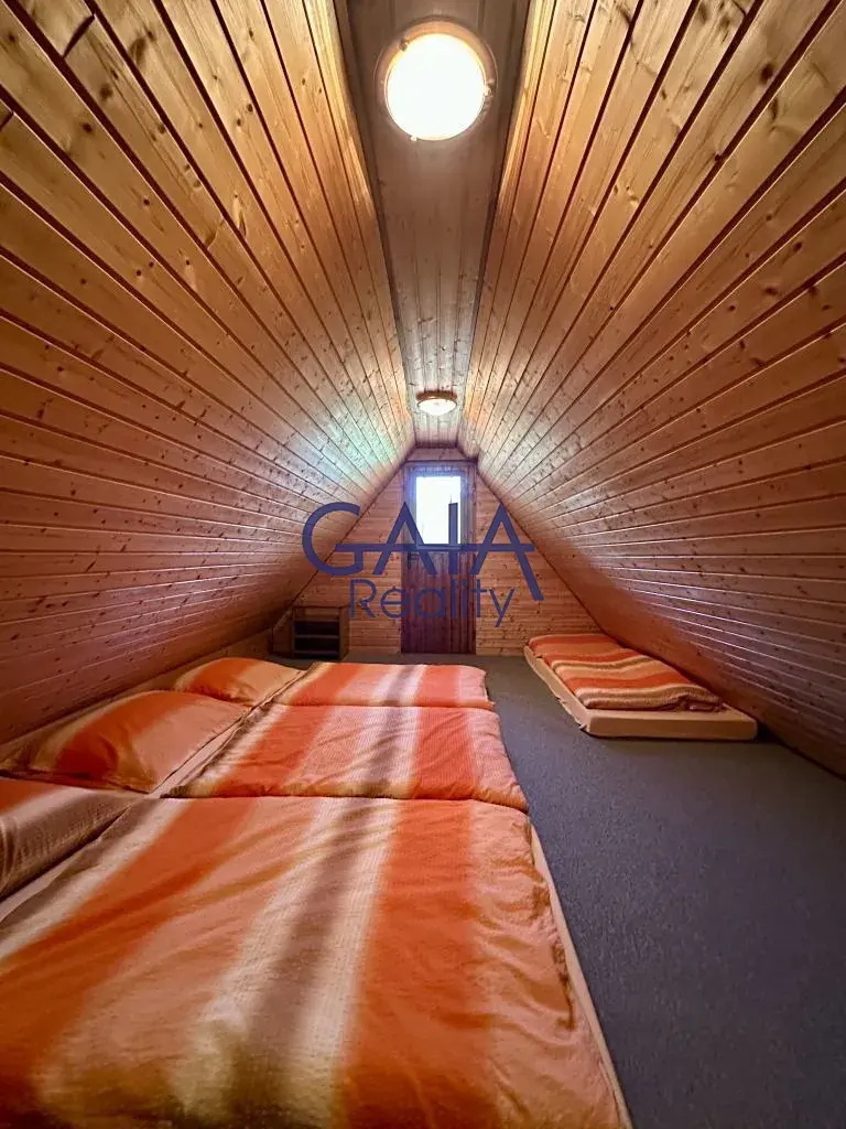 V přízemí chaty se nachází velká společenská místnost s krbem, kuchyň a koupelna se sprchovým koutem. Obytné podkroví nabízí 2 místnosti s kapacitou min. 6 lůžek. K příjemnému posezení slouží vyjma společenské místnosti i venkovní terasa s místem pro grilování. Součástí pozemků je vlastní rybníček, ovocné stromy a zahradní domek na uskladnění nářadí.