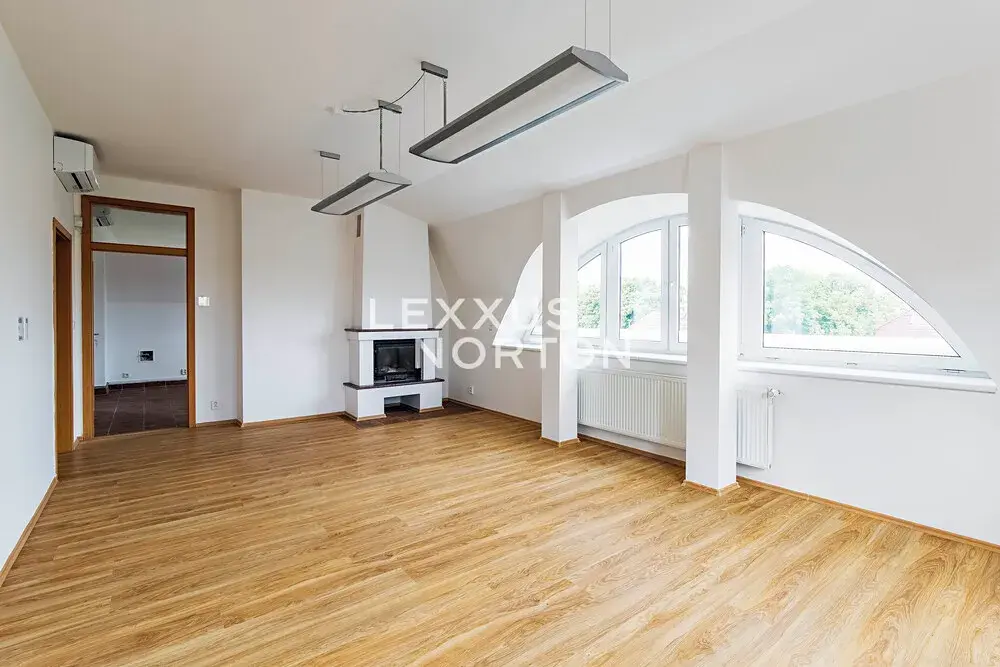 Dispozice bytu nabízí prostorný obývací pokoj s krbem obloženým přírodním kamenem, samostatnou kuchyň a tři ložnice. Dále je k dispozici pracovna, komora, dvě samostatné toalety a dvě koupelny.