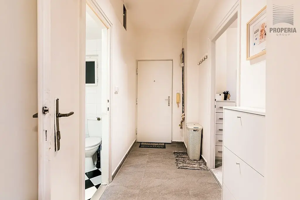 Byt nabízí příjemné a funkční dispoziční řešení. Po vstupu se ocitnete v předsíni, z níž je zajištěn přístup do jednotlivých částí bytu. Kuchyňský kout je vybaven kuchyňskou linkou s vestavnými spotřebiči, konkrétně varnou deskou, troubou, myčkou, lednicí, mikrovlnnou troubou a digestoří, nechybí ani jídelní stůl se židlemi. Koupelna s toaletou je společná, sprchový kout a k dispozici je rovněž pračka.